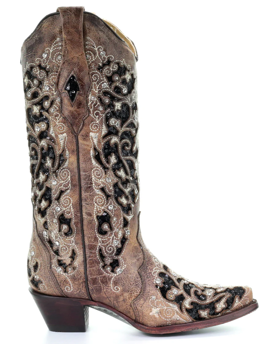 Introducing the Corral Women's Inlay Floral Embroidered Boots – an exquisite combination of style and craftsmanship that will make you stand out on every occasion. With their stunning sequin inlays and intricate floral embroidery, these boots are a true work of art that blend classic design elements and modern embellishments. Each stitch complements the beautiful design crafted into the boot. Furthermore, the decadent stud and rhinestone detailing bring the perfect touch of glamour and sparkle to turn heads wherever you go. Designed with a snip-toe for a very elegant fit, these must-have boots will leave an unforgettable impression. Perfect for a night on the town, a romantic dinner, a country music festival, or even the rodeo, the Corral Women's Inlay Floral Embroidered Boots will be your go-to pair for any event. Don't miss out on the chance to make a stunning statement with fashion and class. Order your pair today and embrace your inner cowgirl chic.